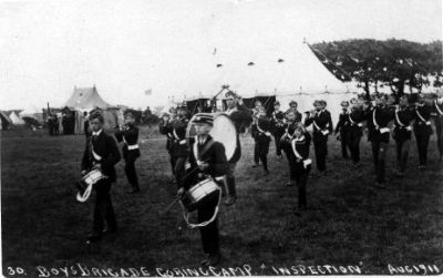The Company has a long History. It was originally formed in October 1908 and its Founding Captain Was William Cotsell who remained as Captain until 1938 . The attached photo shows the Company in 1910 . Mr Cotsell is shown on the right of the Company. From it's earliest days that Company went to camp and had a band . The next picture shows the Company fife band at Camp in 1911 at Goring.